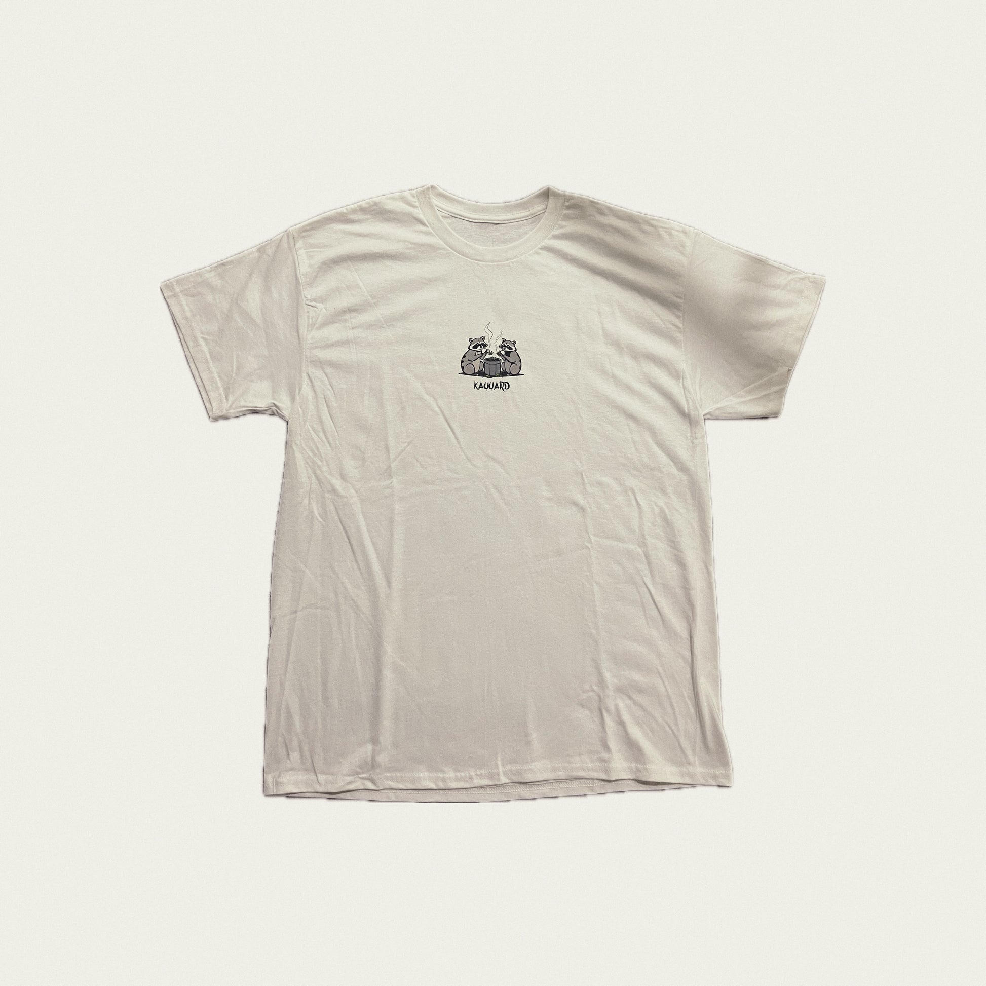Chaos lives in the alley. The KAYYARD White “Raccoon” Tee captures two raccoons posted in the trash, unbothered, finding calm where others see ruin. A symbol of survival, instinct, and defiance.